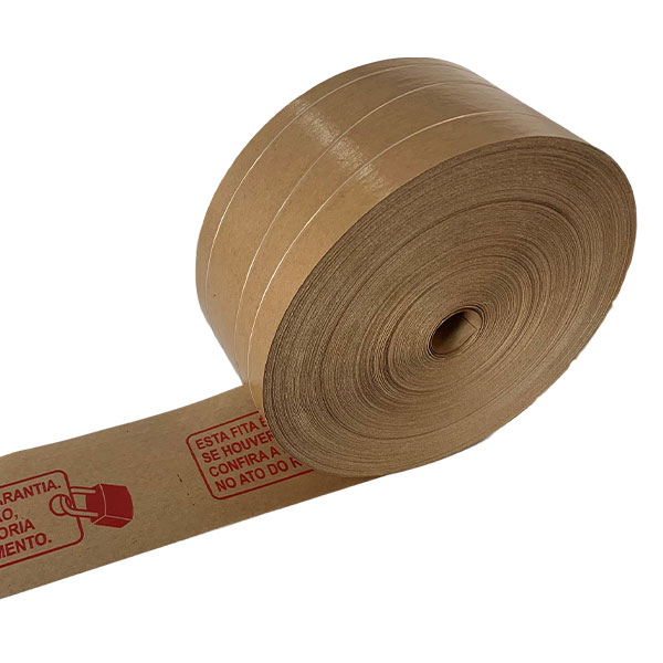 Fita de Papel Kraft, qualidade Natural ou Monolúcido, gramatura 80GRS com adesivo vegetal. Com Reforço de 03 fios de nylon e impressão padrão cadeado de segurança, em vermelho ou preto.